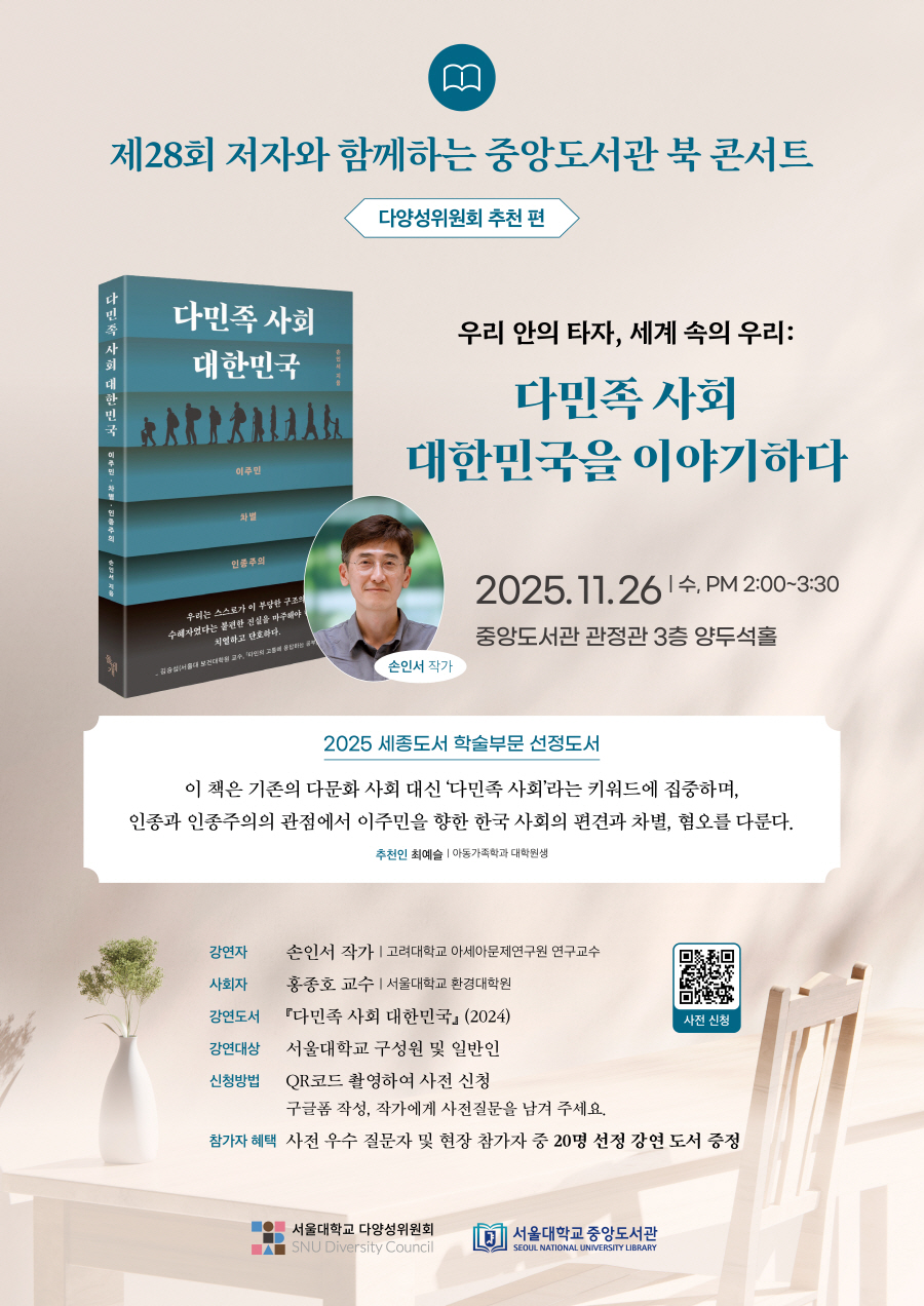 서울대학교 다양성위원회와 중앙도서관이 공동으로 주최하는 「제28회 저자와 함께하는 중앙도서관 북 콘서트 – 다양성위원회 추천 편」에 여러분을 초대합니다.